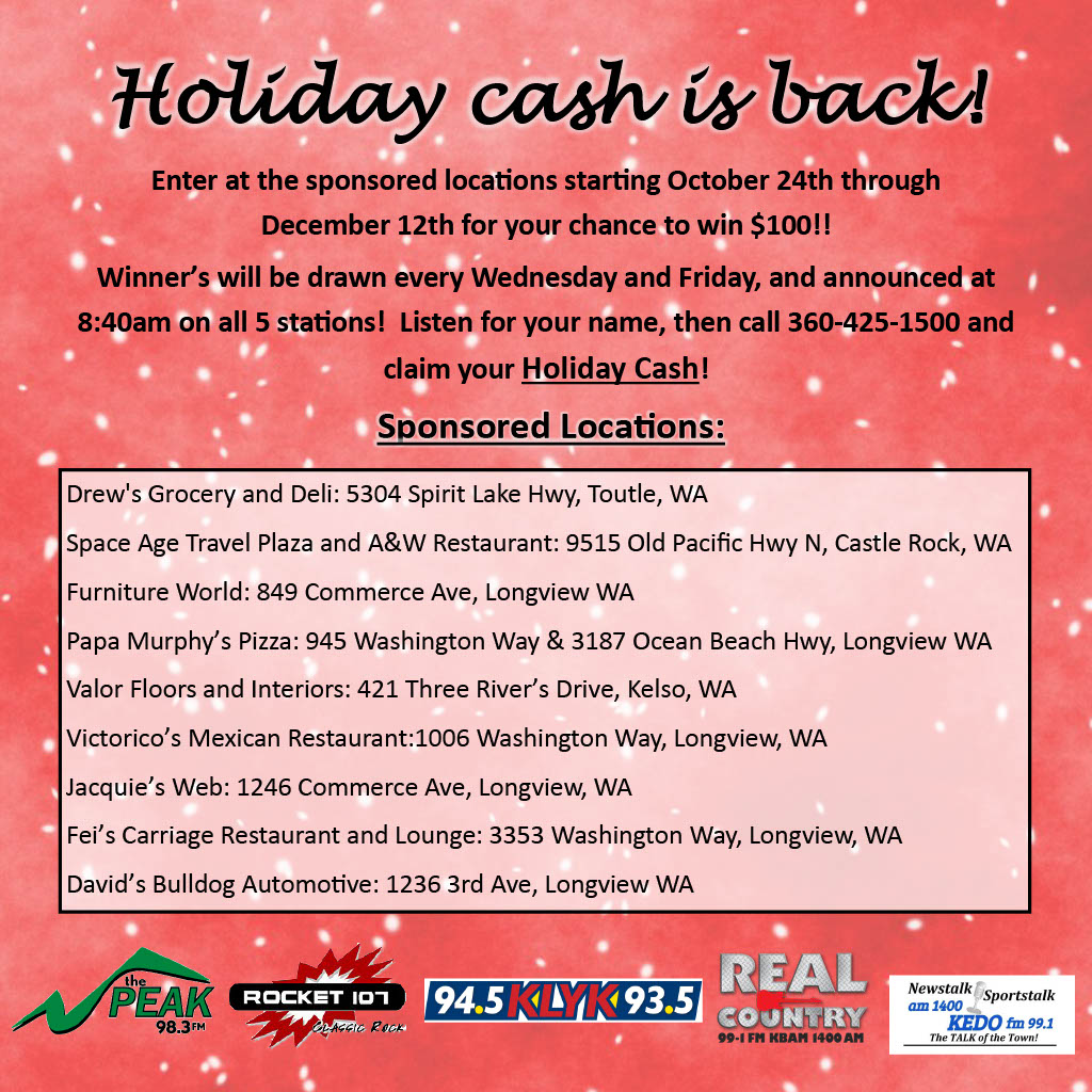 Enter through December 12th for your chance to win $100. We will draw a winner every Wednesday and Friday at 8:40 AM during Peak Mornings with Dacota. Listen for your name, if you hear your name call us within 100 minutes to claim the Holiday Cash. View the list of sponsor locations, where you can sign up.